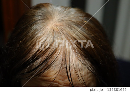 「白髪と薄毛で頭皮が透けるシニア女性の頭頂部写真|エイジングヘア・脱毛症例の参考素材」