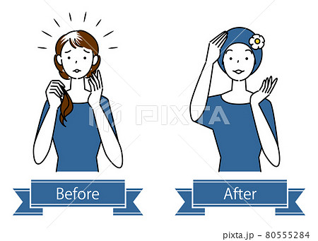 ヘアケア 薄毛対策で医療用のお洒落なケア帽子をかぶる可愛い女性のビフォーアフター イラスト シンプル