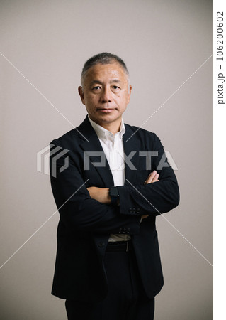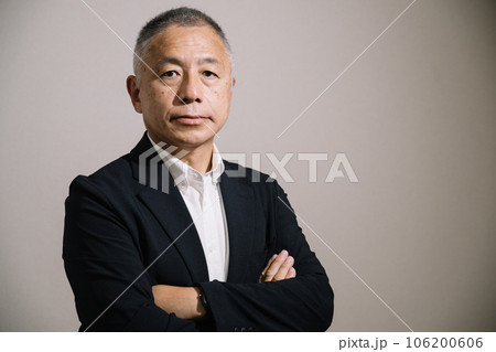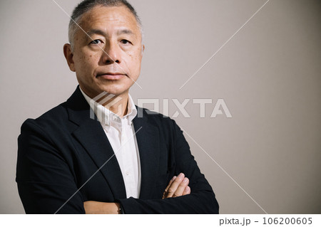 睨む・怖い・真剣な顔をして腕組みをするシニア男性