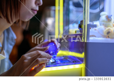 クレーンゲームに熱中する若い女性のクローズアップ