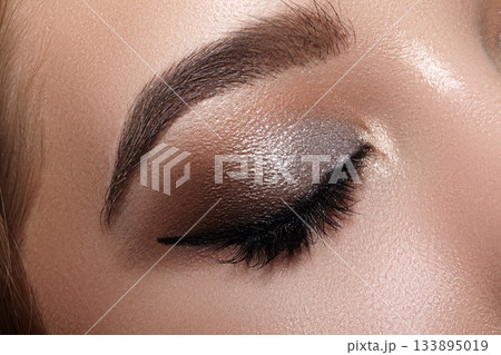 Closeup Macro of Woman Face with Silver Eyes Make-up. Fashion Celebrate Makeup, Glowy Clean Skin, perfect Shapes of Brows