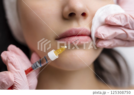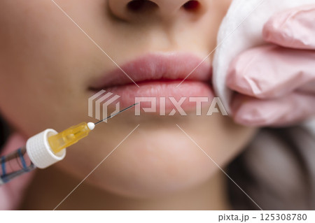 lip shape correction procedure in a cosmetology salon. The specialist makes an injection on the lips of the patient. Lip augmentation.