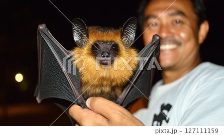 Giant fruit bat with golden brown fur and large wings held by smiling man at night, showcasing unique animal and joyful moment