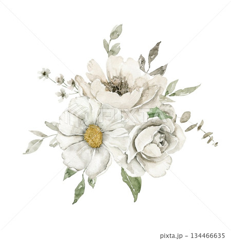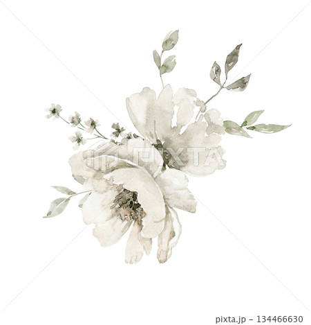 Loose watercolor style floral illustration featuring two off white flowers, green foliage, and small pink berries. Great choice for wedding suite, greeting card design, label, or stationery decor.