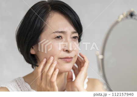 鏡を見ながら顔に手をあてる50代前半の女性 悩み・肌トラブル ビューティーイメージ