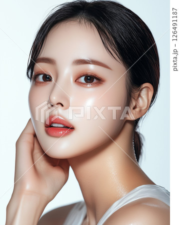 Korean skincare model showcasing glowing complexion and beauty trends in studio setting