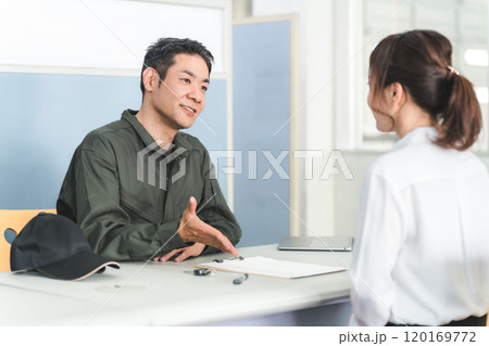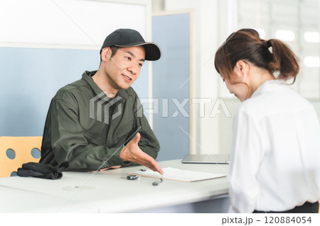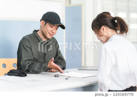 自動車整備工場の受付で説明・見積もり・提案をする整備士の男性と顧客の女性