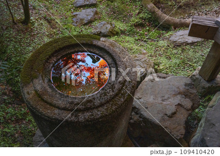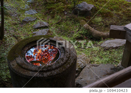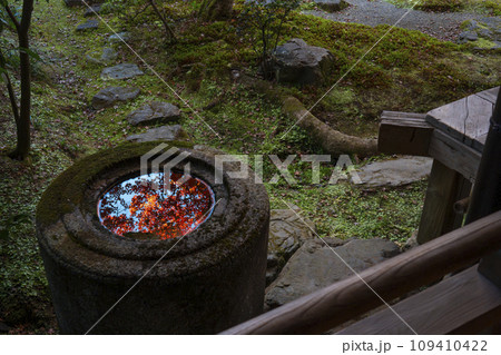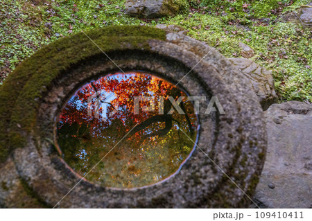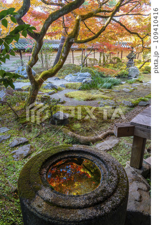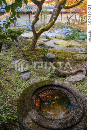 秋の京都 永観堂(禅林寺) 茶室「顧庵」前庭と紅葉が映り込む蹲