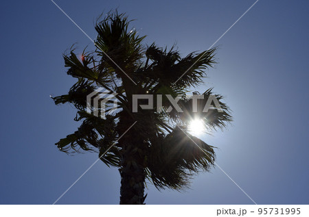 風に揺れるヤシの木と太陽 ワシントンヤシ グラフィック素材