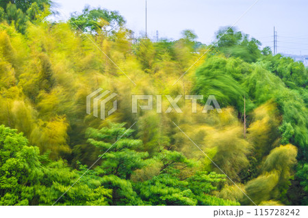 日本の横浜都市景観 春の嵐で、黄色く染まった美しい竹林が大きく揺れる…耐える、強風などのイメージ