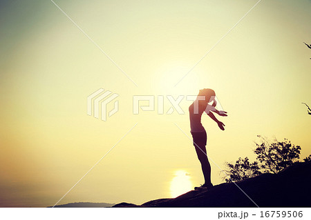 cheering woman open arms at sunset mountain peak