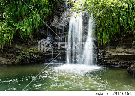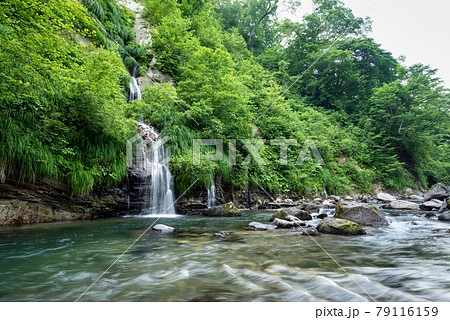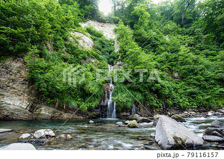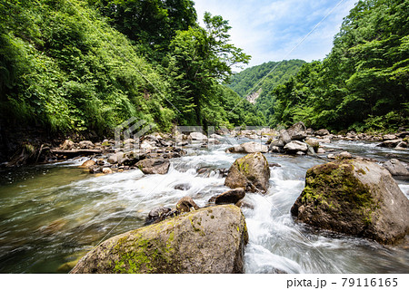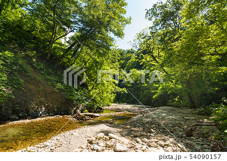 ブナの森の流れの透明な涼しい渓流とタニウズキ