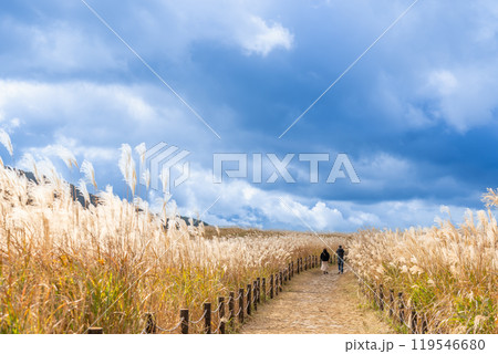 奈良県宇陀郡曽爾村にある秋の曽爾高原に生えるすすきと散策路