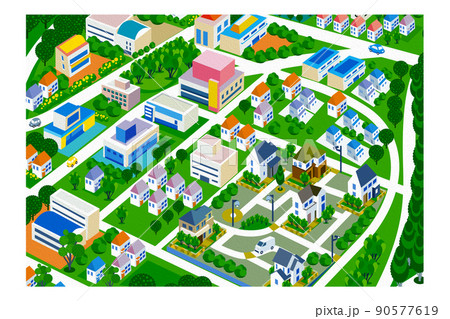 油彩風のエンボス。美しい街並みと暮らしの風景。人々が明るく暮らせる自然と住宅が溶け込む街づくり。
