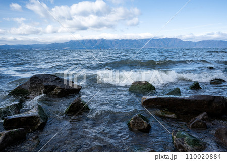 琵琶湖に季節風が吹く季節に湖岸に打ち寄せる波の風景