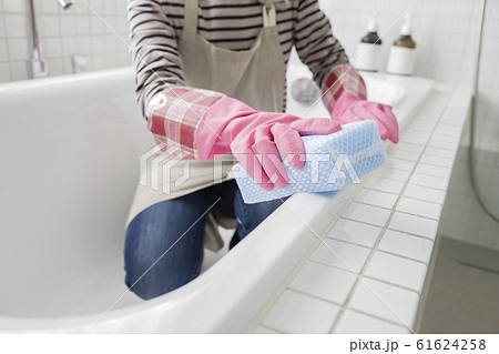 【風呂掃除をするミドル主婦 泡 水栓有】