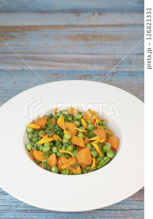 Fresh garden peas and carrots cooked in butter, garnished with chives and marigold flowers for a