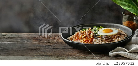 Delicious ramen bowl with toppings served in a traditional black bowl at a cozy restaurant