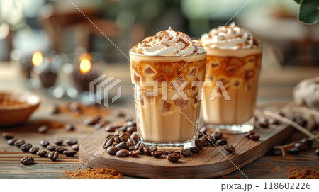 A cafe table with iced coffee lattes, garnished with coffee beans and whipped cream