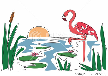 Single continuous line drawing flamingo bird standing on the lake with sunset view. Amazing view towards evening. Environmental. Ecosystem. World Wetlands Day. One line design vector illustration