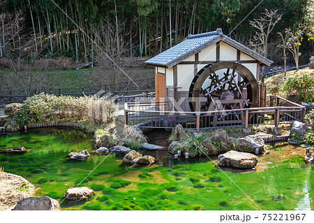 水車小屋 稲城市|上谷戸(かさやと)親水公園の水車小屋の池コケの緑の上に浮かび上がったように見えます