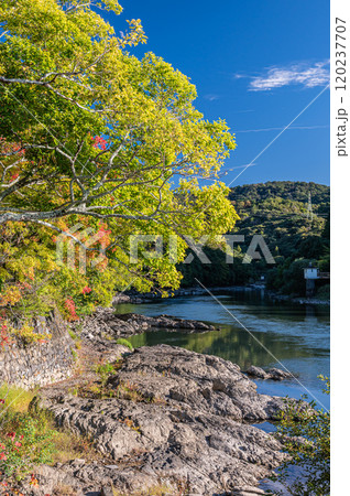 宇治川沿いの黄色く色づいた木々 京都府宇治市