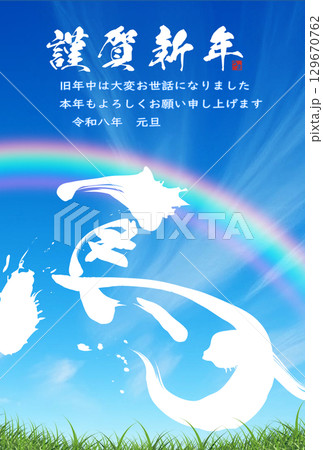 馬と草原の白い雲と青い空の年賀状テンプレート