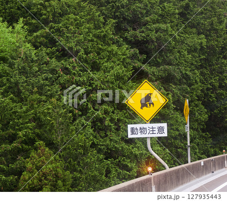春の日本の山の新緑と高速道路に設置された動物注意のマーク