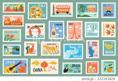 Post stamps. Landscape landmarks architectural objects colorful illustrations for postcards recent vector template pictures