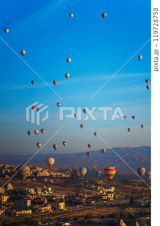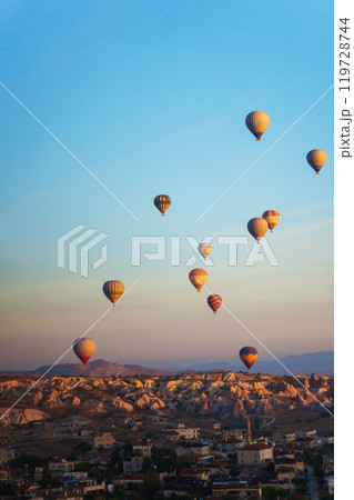 Colorful hot air balloons fly gracefully over a vibrant skyline in valley Cappadocia Turkey