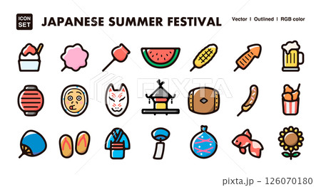 日本の夏祭りアイコンイラストセット 縁日、盆踊り、花火大会、夏の風物詩のベクター素材