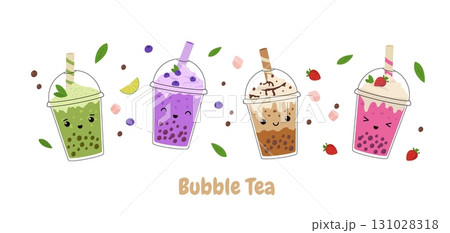 Kawaii bubble milk tea with tapioca pearls set. Asian Taiwanese beverage. Cartoon vector illustration.
