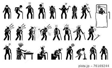 Sick old man infected with disease signs and symptoms. Vector illustrations icons of elderly old man with sickness and illness showing symptoms and syndromes of infection and health problems.