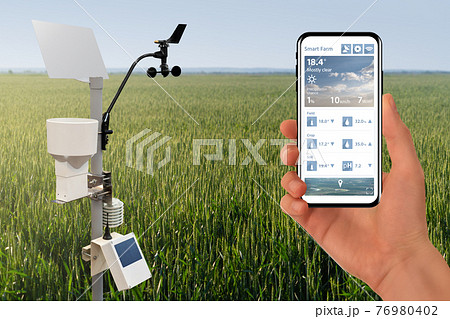 Farmer control weather station via mobile app. Precision and smart farming equipment