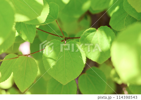 カツラの木 新緑の葉っぱ ハート型の美しい葉 初夏を感じさせるこもれび 緑の背景