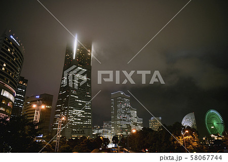日本の横浜都市景観 大気の状態が不安定な横浜。横浜ランドマークタワーを覆い隠す雲