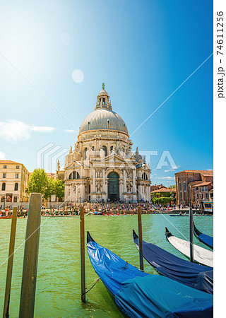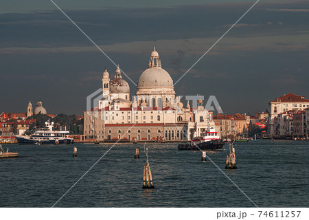 Colorful view of Basilica di Santa Maria della Salute and busy Grand Canal at sunset, Venice, Italy, summer time