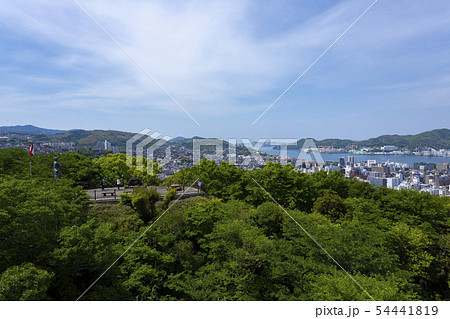 長崎市街地を俯瞰する風頭公園の上空から