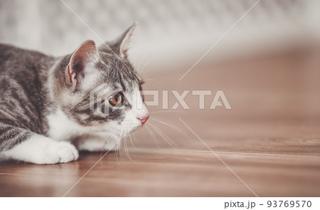 Cat hunting to mouse at home, Burmese cat face before attack close-up