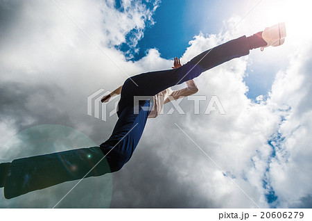 カメラの上を飛び越えるビジネスマン,ローアングル,ビルの背景