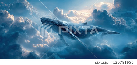 A majestic humpback whale soars through a surreal sky filled with puffy, dreamlike clouds, creating a powerful image of freedom and wonder