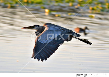 飛んでいる大アオサギ-クロ-ズアップ バ-ナビ-レイク ブリティッシュコロンビア州 カナダ