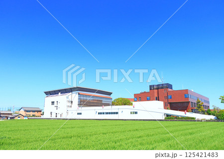 愛知県飛島村、飛島村役場と飛島村体育館の風景