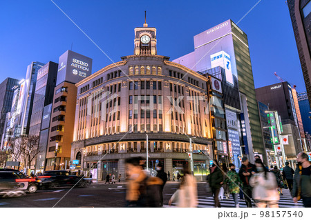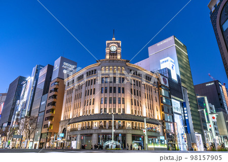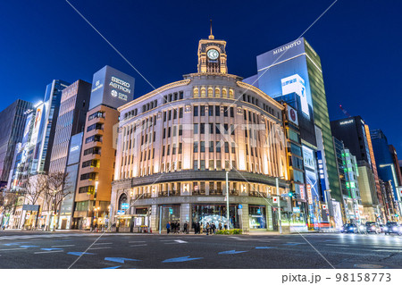 日本の東京都市景観 元日、煌めく銀座。行動制限のないお正月。散策を楽しむ外国人観光客が目立つ