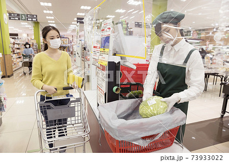 感染対策をしたスーパーのレジで仕事をする女性従業員 シート越し