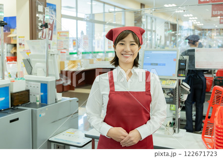スーパーのレジで働く女性