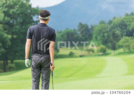 ゴルフ場でアイアンショットをするゴルファーの男性