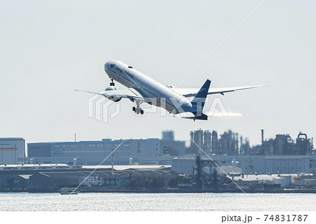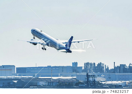 空港の風景 離陸中の飛行機と工場群 東京都大田区