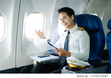 Asian Confident male pilot in uniform leaning at the passenger seat while standing inside of the airplane flight cockpit during takeoff and checking flight plan