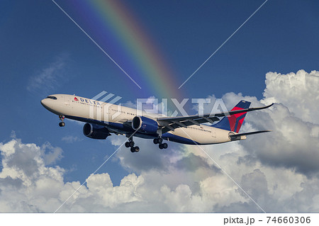 【浮島町公園からA滑走路に着陸する デルタ航空機 虹と空合成】